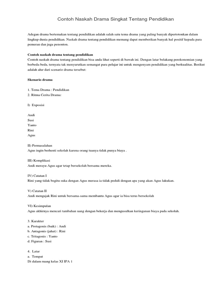 Contoh naskah drama 2 contoh naskah drama untuk 10 orang. Contoh naskah drama untuk 10 orang pemain membuat naskah dialog drama untuk 10 orang pemain memang dibutuhkan kejelihan serta memerlukan sumber inspirasi yang baik, karena naskah drama untuk 10 orang pemain ini lazimnya akan berisikan banyak teks dialog sehingga proses pengerjaannya biasanya relatif memakan waktu. Naskah drama kebencian sahabat hanya sesaat. Contoh drama singkat orang antagonis dan protagonis yang pasti gokil abis banget dari tingkah laku dan kelakuan orang yang selalu menjadikan seseorang menangis motivasi contoh drama singkat orang antagonis dan protagonis analisis struktural dalam drama kejahatan membalas dendam karya a idrus untuk info kali ini tentunya tingkah laku contoh. Berikut ini tersedia beberapa artikel yang menjelaskan secara lengkap tentang contoh naskah drama.