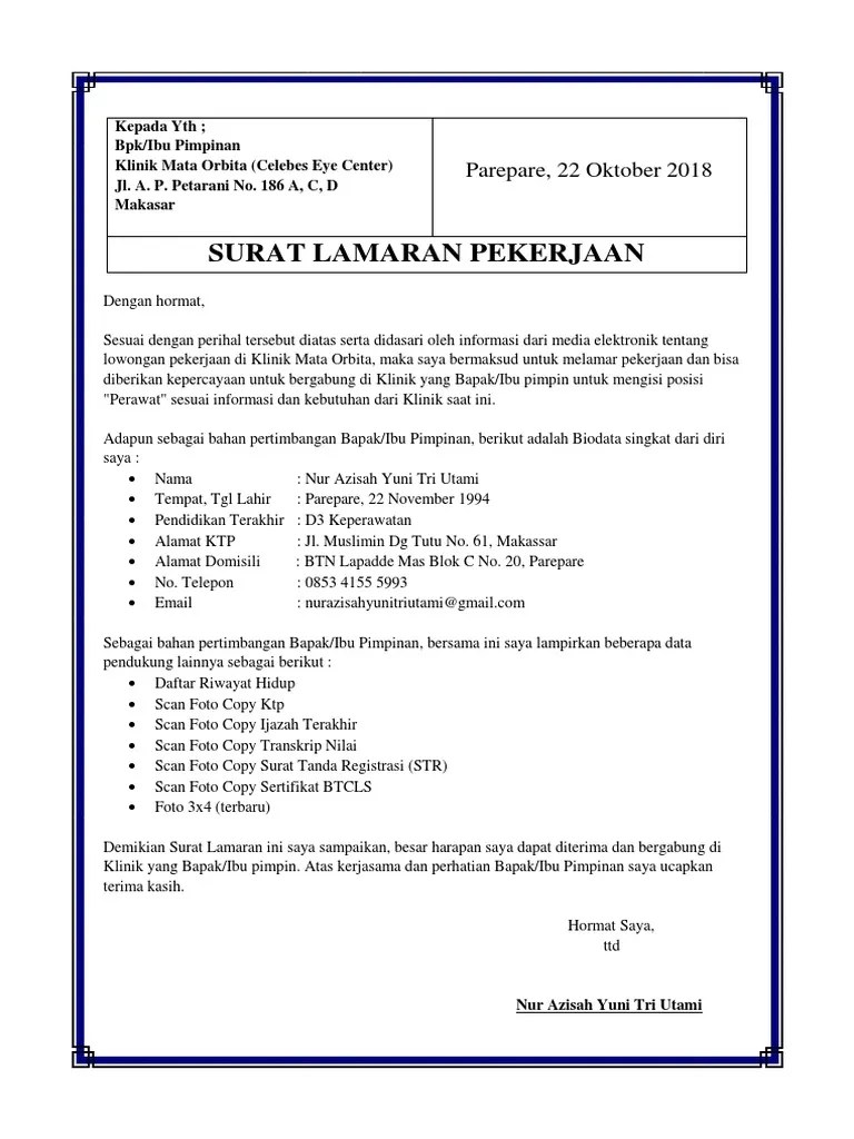 Berisi contoh surat lamaran kerja di rumah sakit sebagai perawat, bidan, asisten apoteker, dan bagian administrasi. 9 contoh surat lamaran kerja tulis tangan 2021. Baik anda berobat ke dokter rumah sakit, dokter klinik, maupun ke puskesmas dan bidan. Panduan lengkap dan contoh cara membuat surat lamaran kerja tulis tangan untuk pt,pabrik,bank,toko,rumah sakit, . Contoh surat lamaran kerja adalah sebuah contoh surat . Download contoh surat lamaran kerja dokter umum di klinik yang dapat diunduh secara lengkap dan gratis tanpa perlu daftar. Lamaran kerja sebagai.(sebutkan formasi yang dilamar). Sebagai tambahan, berikut saya melampirkan . 15+ contoh surat lamaran kerja dokter klinik kecantikan. Contoh lamaran kerja dan cv articles and images about surat job education. Sehubungan dengan dibukanya lowongan pekerjaan di klinik bersalin sayang bunda, saya bermaksud untuk melamar pekerjaan tersebut. 99 contoh surat cinta romantis untuk senior & pasangan. Alhamdulillah saya juga memiliki pengalaman bekerja sebagai apoteker di salah satu klinik kesehatan di kab.
